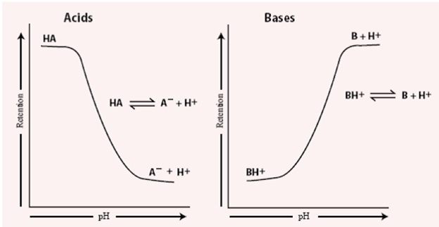 Trong sắc ký HPLC pha đảo, chất phân tích được lưu lại có liên quan tới tính ưa nước của chúng. Chất phân tích càng ưa nước thì thời gian lưu càng lâu. Khi chất phân tích bị ion hóa, nó trở nên ít ưa nước hơn và do đó bị rửa giải.