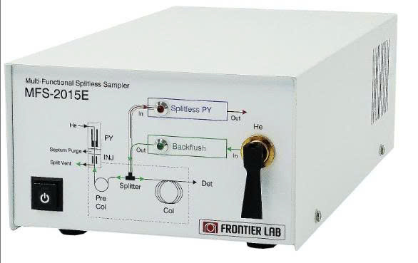 Phương pháp tiêm mẫu F-Splitless giúp cải thiện đáng kể độ nhạy phát hiện của các sản phẩm nhiệt phân. Kỹ thuật rửa ngược giúp rút ngắn thời gian phân tích và giảm thiểu nhiễm bẩn hệ thống. Đây là một phụ kiện ngoại vi được sử dụng độc quyền với thiết bị Bộ nhiệt phân đa năng (EGA/PY-3030D) (Đã được cấp bằng sáng chế tại Nhật Bản và Hoa Kỳ).