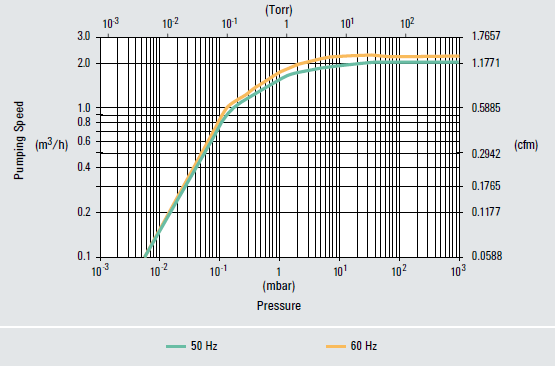 | Tốc độ bơm | 50 Hz 30l/min (1.1cfm) (1.8m3/h) | 60 Hz: 37l/min (1.3cfm) (2.2m3/h) |