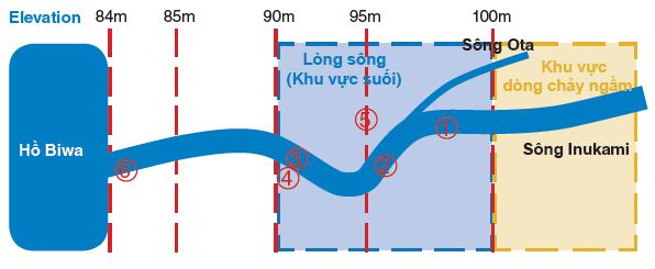 Hình 1: Sáu địa điểm trên sông Inukami đã được chọn để xác định chất lượng nước
