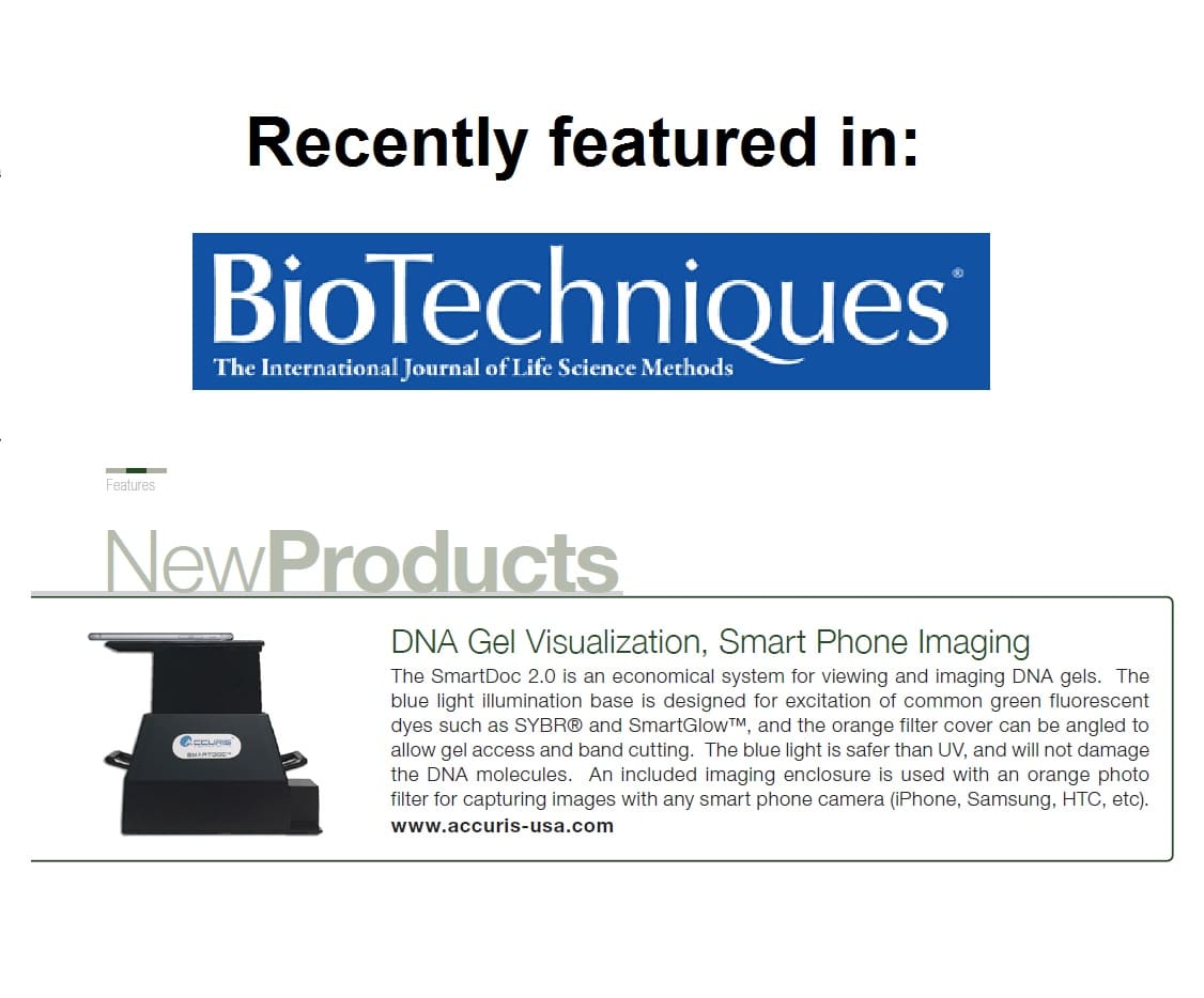 Giới thiệu SmartDoc 2.0 (Mã hàng E5001-SDB). Hệ thống hoàn chỉnh này được phát triển để quan sát an toàn axit nucleic trong gel agarose và chụp ảnh kỹ thuật số chất lượng bằng camera điện thoại thông minh. Ánh sáng xanh được sử dụng thay vì UV, giúp an toàn hơn cho nhân viên phòng thí nghiệm và không làm hỏng mẫu DNA.