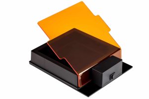 - Hệ thống bao gồm đế chiếu sáng nền ánh sáng xanh, nắp quan sát màu cam và kính lọc chụp ảnh màu cam.