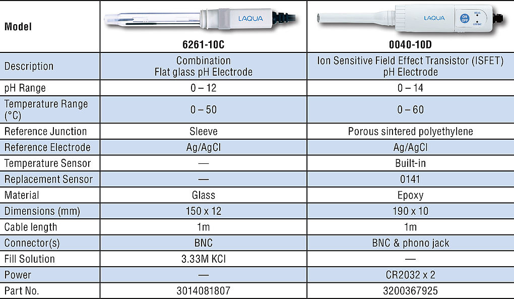 HORIBA cung cấp hai loại điện cực pH phẳng dựa trên hai công nghệ điện cực khác biệt, điện cực pH thủy tinh phẳng tổ hợp 6261-10C và cực điện cực cảm biến nhạy ion hiệu ứng trường ion 0038-10C (ISFET). Phần nhạy trên thân điện cực pH thường là màng thủy tinh dựa trên công nghệ điện cực thủy tinh, còn bộ cảm biến của điện cực cải tiến được tạo nên dựa trên việc thu nhỏ chất bán dẫn sử dụng công nghệ bóng bán dẫn pH. 6261-10C là điện cực pH tổ hợp với thân thủy tinh có thể chống lại các tác động hóa học và mối nối có vỏ cứng giúp ngăn ngừa tắc nghẽn bởi tốc độ dòng tương đối cao so với mối nối gốm thông thường. 0040-10D được thiết kế với chip ISFET và thân không thủy tinh, rất bền, khó vỡ, dễ bảo quản và chống thấm nước. Những ưu điểm của 0040-10D và 6261-10C gồm: