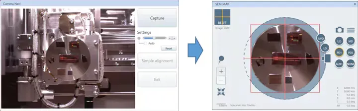 Bên trái: Hình ảnh mẫu vật được chụp bởi camera gắn bên trong buồng. Bên phải: Hình ảnh camera được truyền đến màn hình SEM MAP để điều hướng.[/caption]