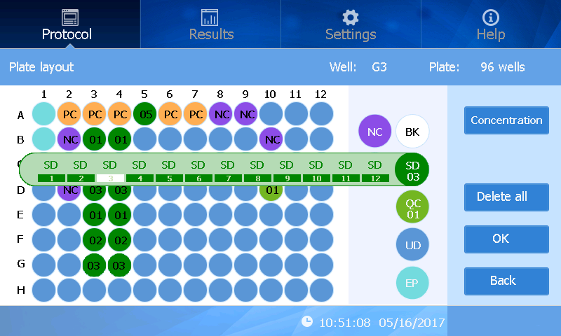Giao diện bố trí đĩa cho phép thiết lập nhanh chóng và trực quan nội dung giếng của đĩa. Màn hình hiển thị hình ảnh mô phỏng đồ họa của đĩa 96 giếng và có thể gán nhãn từng giếng theo yêu cầu: "chuẩn đã biết" (known standard), "mẫu chưa biết" (unknown sample), "giếng trắng" (blank well), "giếng kiểm soát QC" (QC control well), "đối chứng âm" (negative control), "đối chứng dương" (positive control) hoặc "trống" (empty). Giao diện cho phép tô sáng và gán nhãn nhiều giếng để tiết kiệm thời gian.