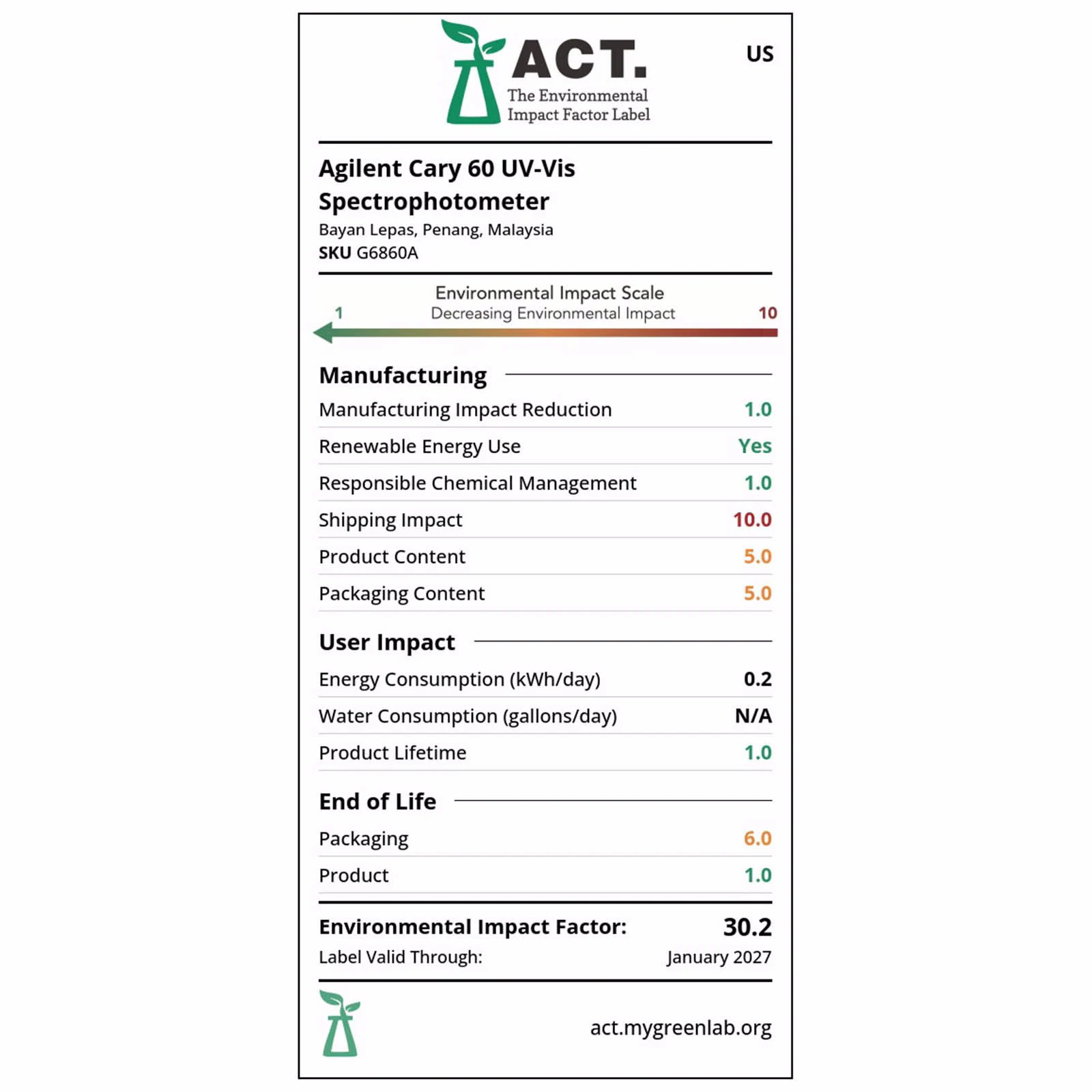 - Chọn tính bền vững: Cary 60 UV-Vis đã nhận được nhãn ACT (Trách nhiệm giải trình, Tính nhất quán, Tính minh bạch) của My Green Lab sau khi được kiểm toán độc lập về tác động môi trường trong suốt vòng đời sản phẩm.