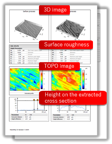 Tự động tính toán dữ liệu từ bề mặt mẫu hoặc mặt cắt ngang địa hình để xác định độ nhám bề mặt và chiều cao cấu trúc, hoặc thực hiện các phép đo khác nhau giữa 2 điểm.
