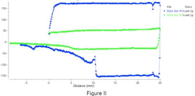 Hình II: Đồ thị Tải trọng so với Khoảng cách minh họa rõ hơn lực cản thiết bị đè đùn ép và rút mẫu. Dầu gội cao cấp thể hiện độ cứng và độ bám dính cao hơn so với dầu gội bình dân.