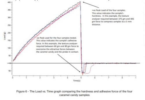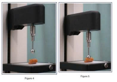 Bài kiểm tra thực hiện nén kẹo caramel đến một khoảng cách nhất định, đo lực cần thiết để làm biến dạng mẫu và đo lực dính khi đầu dò rút lên.