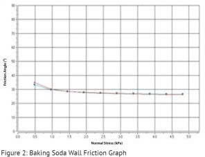 Ma sát thành: Hình 2 cho thấy các góc ma sát thành được đo ở các mức áp suất pháp tuyến khác nhau bằng cách sử dụng nắp đậy bằng thép không gỉ. Góc ma sát thành hiệu dụng xấp xỉ 35° ở mức áp suất pháp tuyến thấp (0.5 kPa) và giảm xuống còn khoảng 27° khi mức áp suất tăng lên (4.75 kPa).