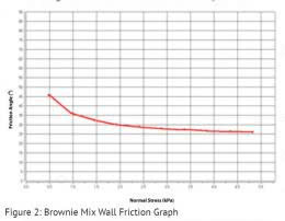 Ma sát thành: Hình 2 biểu diễn góc ma sát thành ở các mức ứng suất nén khác nhau. Góc ma sát thành đại diện cho lực ma sát giữa bột đang trượt và thành phễu hoặc máng trượt tại thời điểm bắt đầu chảy. Trong thử nghiệm này, một nắp bằng thép không gỉ đã được sử dụng. Ở mức ứng suất nén thấp khoảng 0.5 kPa, góc ma sát thành xấp xỉ 45°, và giảm xuống còn khoảng 25° ở các mức ứng suất nén cao hơn (4.75 kPa). Các góc ma sát thành trên 20° được coi là cao.