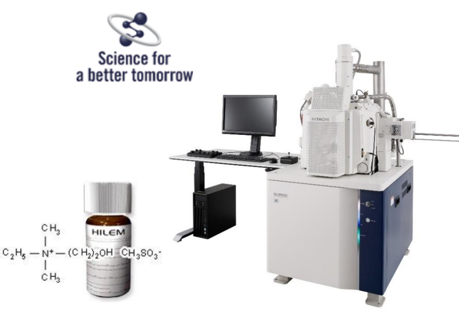 Chất lỏng ion là một loại muối dạng lỏng có các đặc tính sau ở nhiệt độ phòng: (1) độ bay hơi thấp ngay cả trong môi trường chân không và (2) có khả năng dẫn điện. Các chất lỏng ion HILEM® của Hitachi có hai loại: IL1000 ưa nước và IL2000 kỵ nước. Tài liệu này giới thiệu các ví dụ quan sát mẫu sinh học được xử lý bằng IL1000 bằng kính hiển vi điện tử quét W-SEM SU3900 của Hitachi. Dòng SU3900 cho phép quan sát các vùng diện tích lớn của mẫu, bao gồm cả mẫu động vật và thực vật, vì buồng mẫu lớn của nó cho phép quan sát ở độ phóng đại thấp với khoảng cách làm việc dài. Hình 1 (a) và (b) là kết quả quan sát một loài động vật giáp xác nhỏ, tôm nước mặn, được xử lý với 5% IL1000. Toàn cảnh con tôm (a) có thể được quan sát với phần lưng của bụng uốn tròn giống như hình thái khi còn sống. Loài tôm này bật nhảy bằng cách duỗi nhanh phần bụng tròn. Râu thứ hai được biểu thị bởi mũi tên màu vàng.