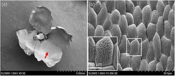 Hình 2 (a) và (b) là hình ảnh SE của một bông cải xanh được cố định bằng Glutaraldehyde và ngâm trong IL1000 5%. Đặc điểm chung của bông hoa dưới điều kiện chân không (a) giống với hình thái của nó ở áp suất khí quyển với những cánh hoa nở rộ. Ở hình ảnh phóng đại (b) của cánh hoa được chỉ bởi mũi tên màu đỏ, những tế bào biểu bì ở trạng thái ngậm nước được quan sát mà không có bất kỳ tình trạng biến dạng nén nào. Hơn thế nữa, những họa tiết sọc trên bề mặt cũng được xác định ở hình ảnh phóng to.